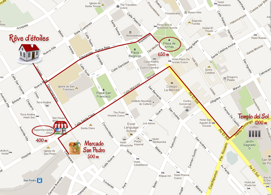 The house is exceptionally well situated in the historical centre of Cuzco, quiet, set back from the road, yet at the same time very close to the hub of the town, 600m from "Arms Square" and 500m from the typical "San Pedro" local market. After a walk in the centre, one can enjoy the sunny patio which at dusk reveals a starry sky.